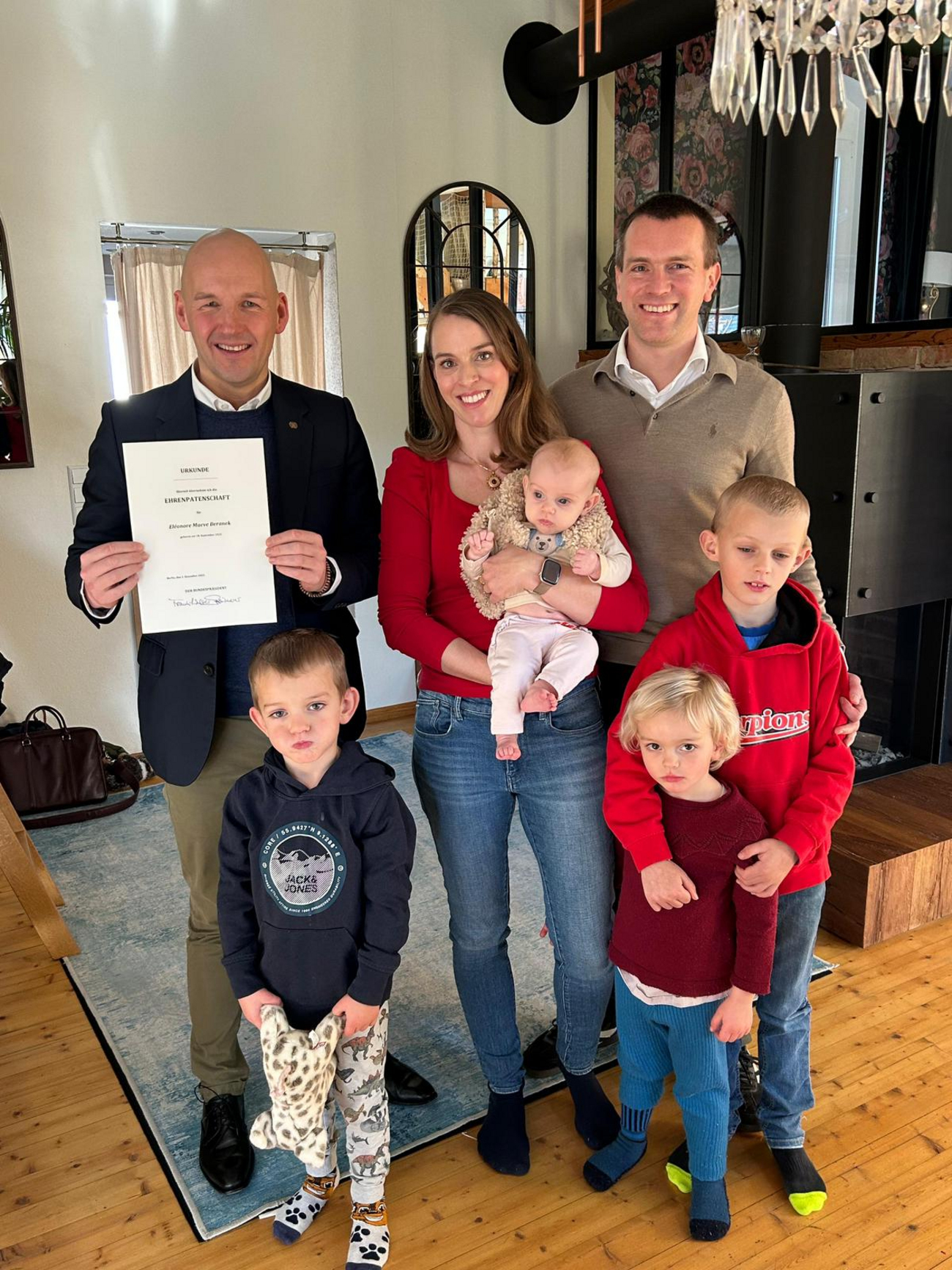 Familie Beranek aus Schönaich hat kürzlich für ihr siebtes Kind eine besondere Anerkennung erhalten: Der Bundespräsident Frank-Walter Steinmeier übernahm die Ehrenpatenschaft für die neugeborene Eléonore. Marc Biadacz, direkt gewählter Bundestagsabgeordneter für den Landkreis Böblingen, überreichte der Familie die dazugehörige Urkunde. "Sieben Kinder - das bedeutet jeden Tag Verantwortung, Organisation und ganz viel Herz. Familie Beranek lebt genau das. Für ihr siebtes Kind, die kleine Eléonore, hat der Bundespräsident die Ehrenpatenschaft übernommen. Ich habe mich sehr gefreut, auf Wunsch der Familie die dazugehörige Urkunde übergeben zu können.", erklärt Marc Biadacz.